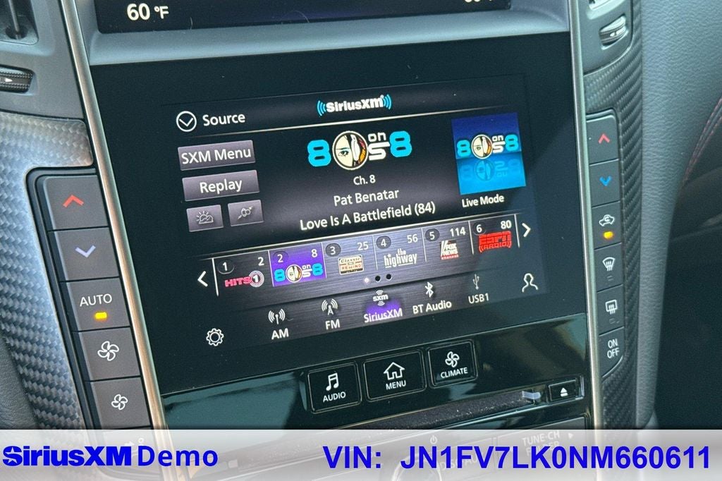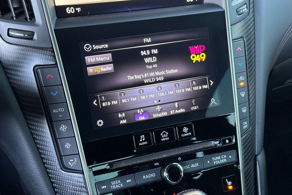 - Radio: INFINITI InTouch w/AM/FM/HD/CD/Navigation -inc: Bose performance series audio 13-speaker stereo, wireless Apple CarPlay, Siri Eyes Free, Android Auto including Google Voice, INFINITI dual HD display system touchscreens, 8-inch upper and 7-inch lower color vehicle-information displays, INFINITI InTuition customizable environment for audio, climate, feature displays and IT functions stored in each INFINITI Intelligent Key, INFINITI voice recognition for audio and vehicle vehicle information systems, speed-sensitive volume control, steering wheel-mounted audio controls, Streaming audio via Bluetooth®, Bluetooth® hands-free phone system w/hands-free text messaging assistant, SiriusXM radio w/advanced audio features and a 3-month complimentary trial, in-glass FM diversity antenna, 2 illuminated USB connection ports (1 type A and 1 type C), 2 12-volt accessory power outlets and auxiliary audio input, navigation w/lane guidance, 3D building graphics, 5 years complimentary trial access to premium traffic and MapCare, voice recognition for navigation functions, including one-shot voice destination entry, SiriusXM Traffic w/3 month complimentary trial access to real-time traffic information, and SiriusXM Travel Link w/3 month complimentary trial access to weather, fuel prices, stock prices, sports scores, movie listings and parking
